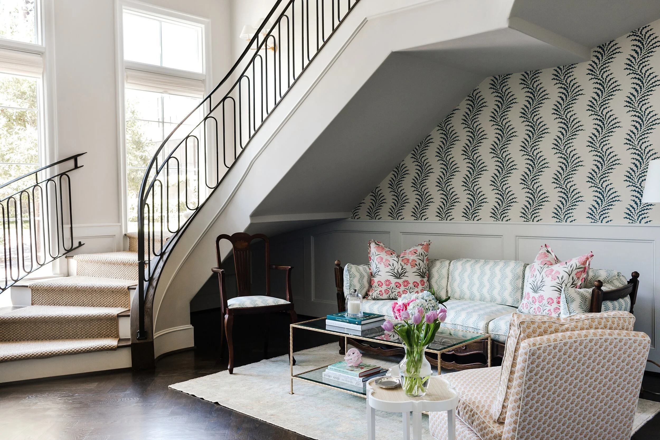 At our Avalon Place project, we were tasked with creating an interior solution that felt harmonious with the existing architecture of this 2018 home in Houston’s River Oaks. In the entry specifically, we employed patterned wallpaper and a clever furniture layout to create an inviting, cozy vignette in what would otherwise have been a cold and cavernous space at the base of the stairs.