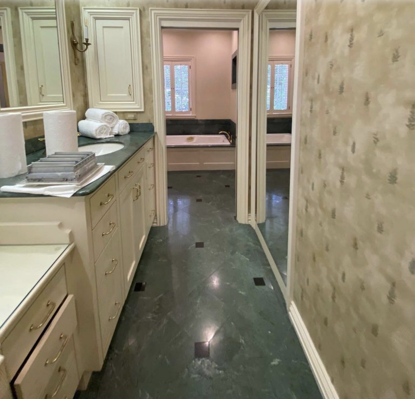 As we mentioned (and you all could read about in the House Beautiful feature of this charming home), our main goal was to keep as much of the historic charm in this house as possible, while updating the spaces to highlight the character the home already held. One goal in the primary bath was to open up the space and draw attention to light in the window to pull in the green, lush, English Country feel that the outdoors provided. As you can see below, the window was completely blocked by the wall between the vanity and the bathtub. The couple ended up deciding to funnel a large portion of their renovation budget into updating the primary bathroom space in order to not only offer more room, but to make the size feel appropriate for the size home it belonged in.