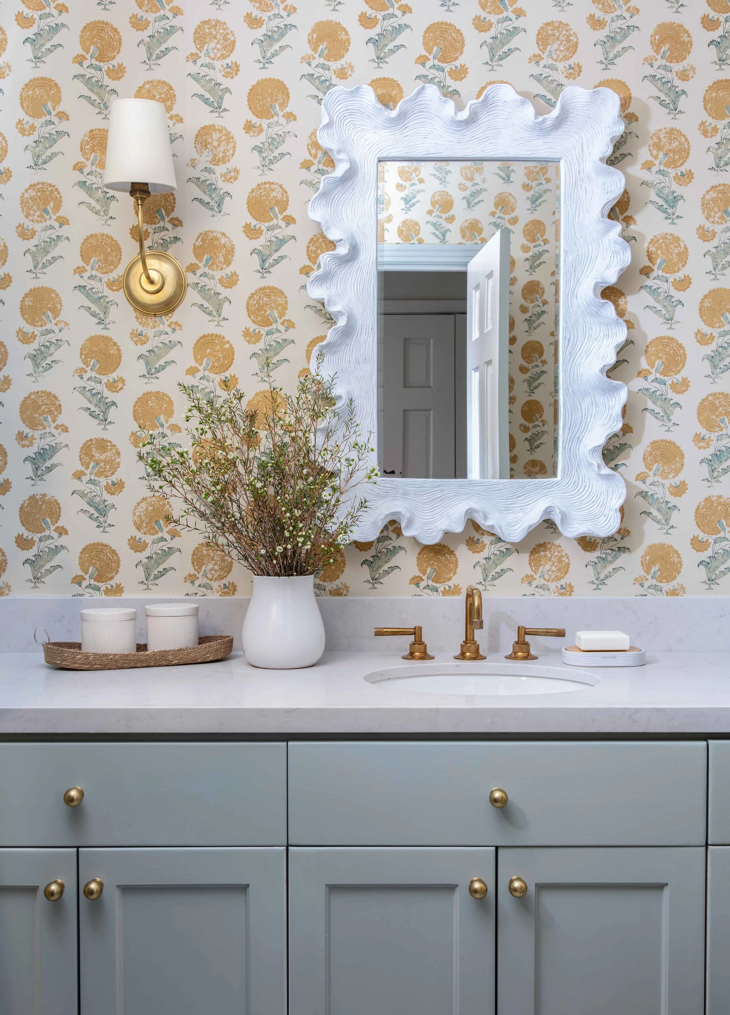 “In the powder room, the cabinetry’s green hue (Benjamin Moore’s Saybrook Sage) was pulled from the leaves on the floral wallpaper. The rectangular mirror with ruffled edges from Ballard Designs adds to the whimsical charm. Good Housekeeping, April 2023”