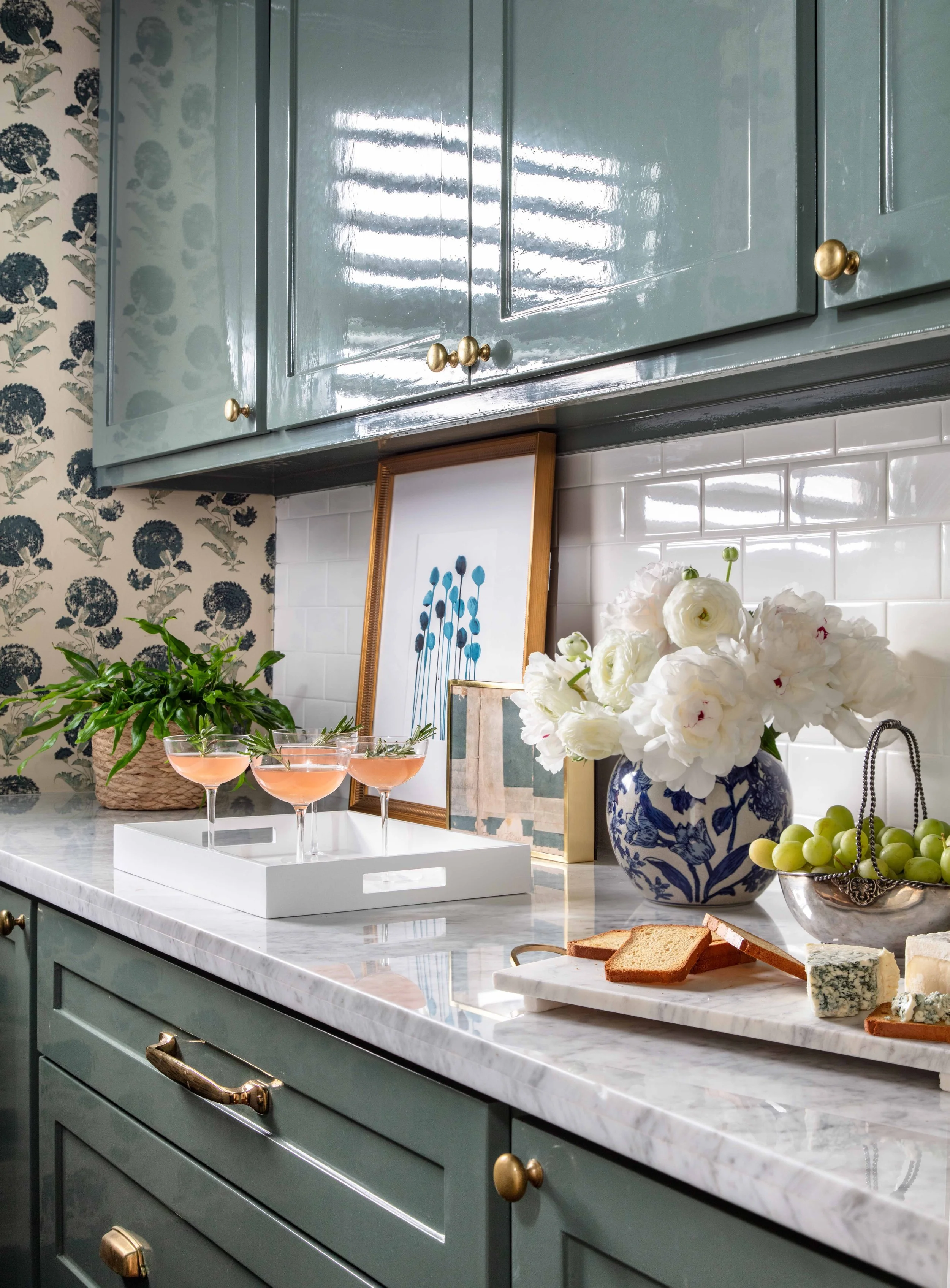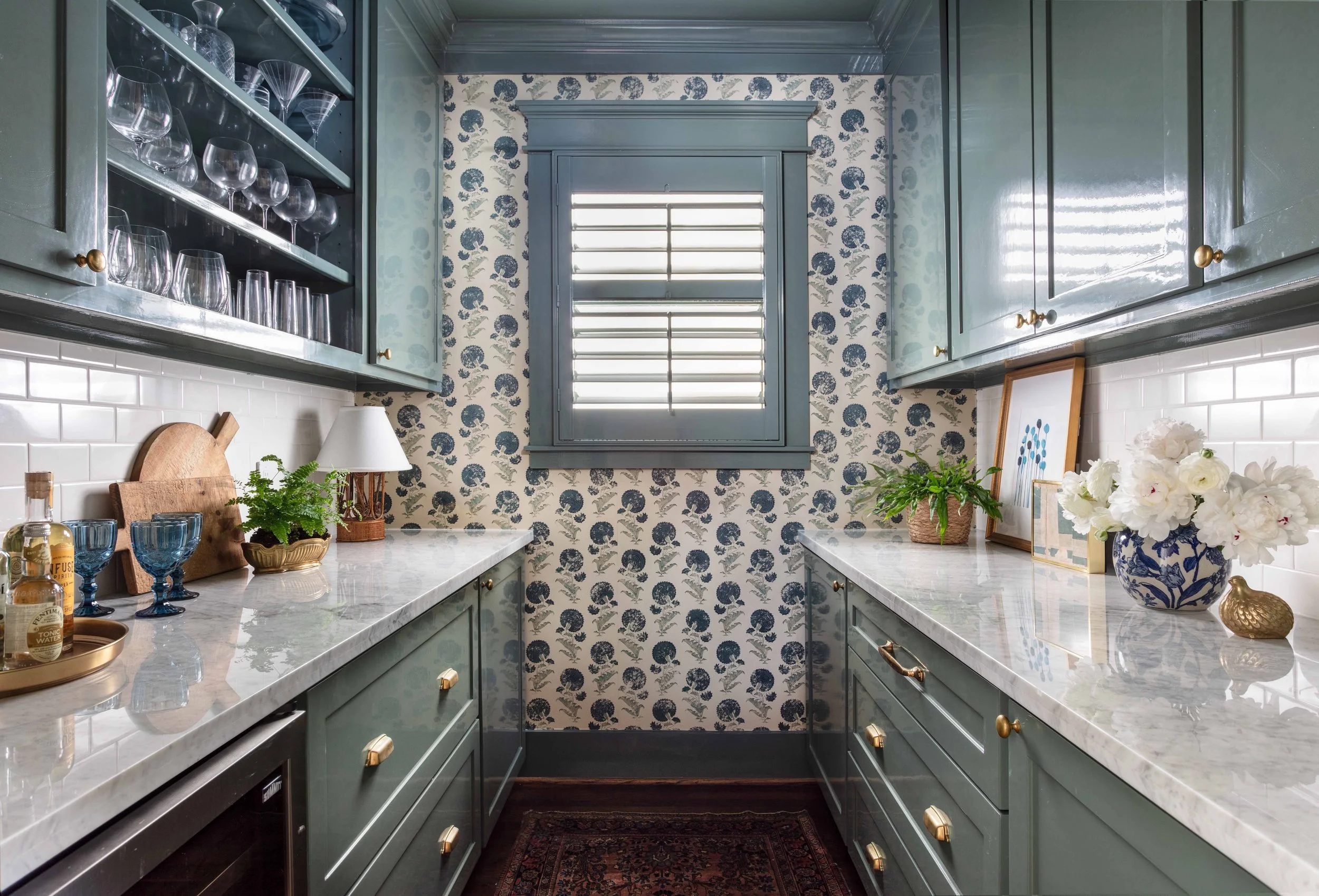 As House Beautiful stated, when they initially renovated the home, the space had been designed in a simple gray-and-white color scheme during the reno/addition build for simplicity's sake. The rest of the home was more neutral, so they embraced a minimalistic palette, just with darker gray tones and pops of unlacquered brass. As they used the space, everyone would call it the ‘fancy pantry’ or the ‘fancy bar’, so Katie wanted to fully commit to that nickname and add some impact in the form of wallpaper and Lacquer. It was always the plan for this room. But as they say, the cobbler’s children…